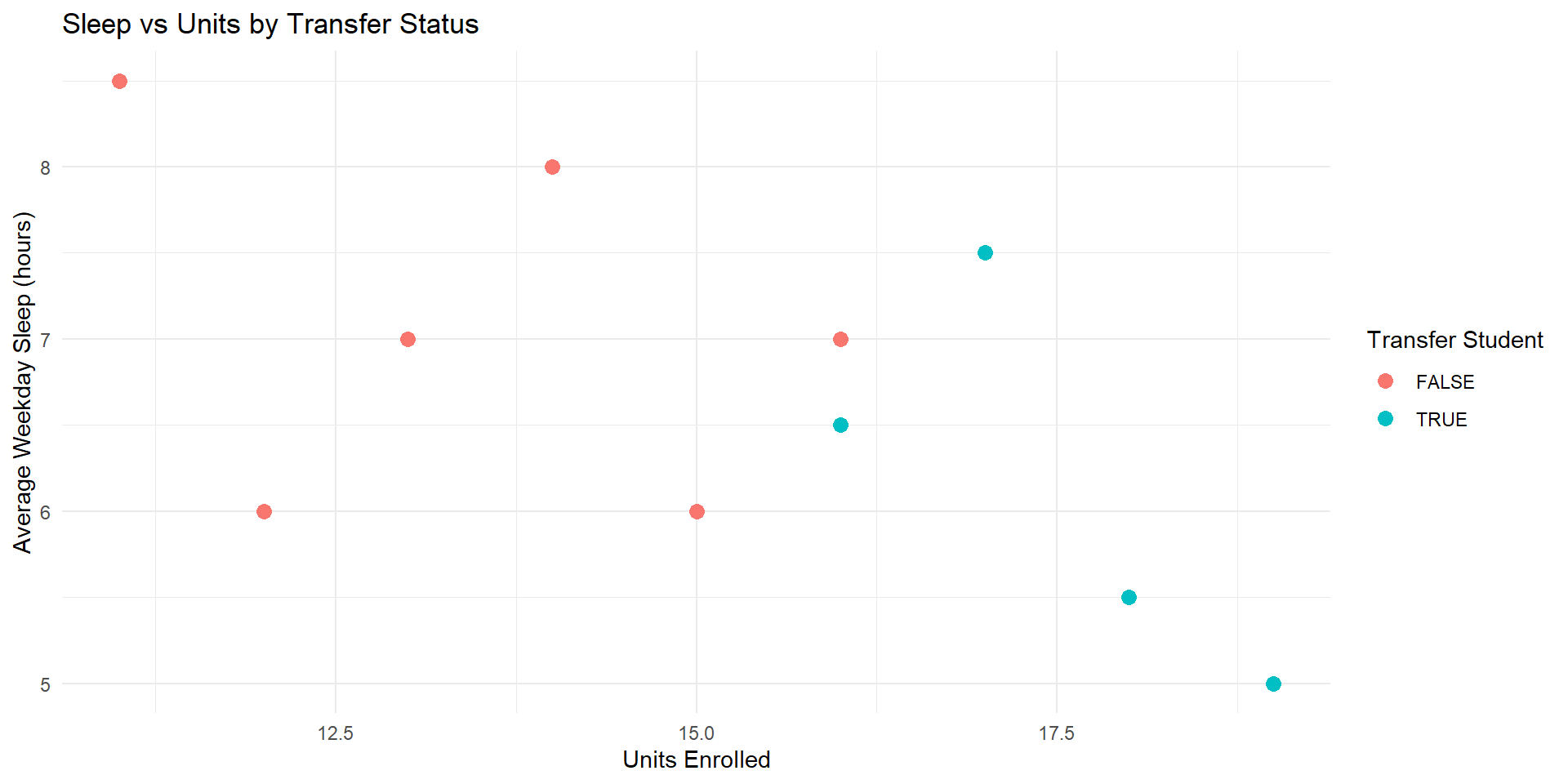 graph3 <- ggplot(sleep_data, aes(x = units, y = sleep_hours, color = transfer)) +
