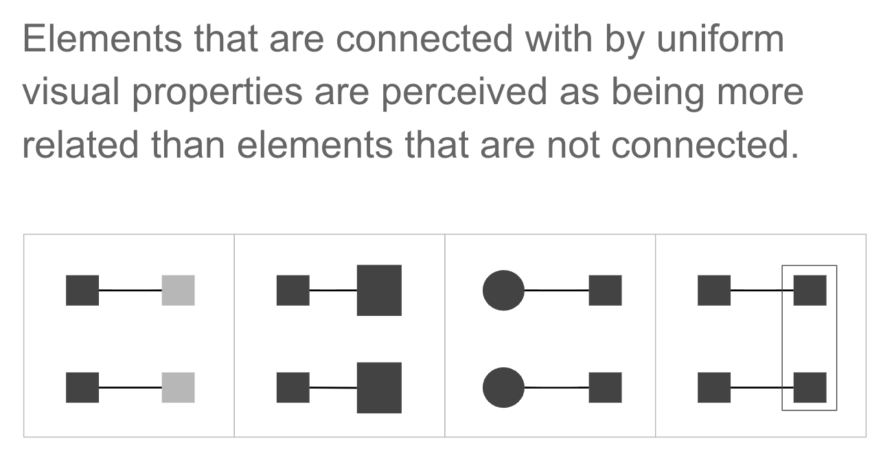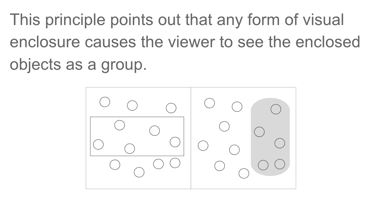 In dataviz: Shaded regions, background panels, and borders create groups without explicit labels. The boundary does the cognitive work for you.