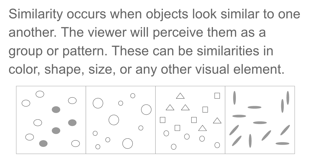 In dataviz: A consistent color for “Democrats” across all charts in a report uses similarity to signal the same category.